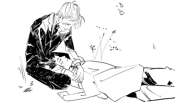 Cassandra Jean e io abbiamo deciso di contribuire con un fumetto per l’Heronstairs Day. Il testo è mio, i disegni suoi. Londra, Hyde Park, 1877. Will si appisola dopo aver trascorso una lunga notte a combattere i demoni, e Jem lo copre con la sua giacca. 🙂 »