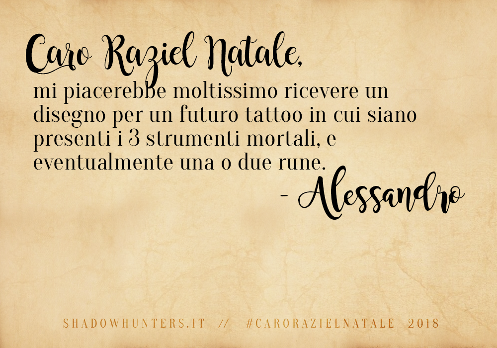 E quindi (prima di passare all’annuncio del vincitore) vorremmo presentarvi sia le letterine che sono state inviate a Raziel Natale che i vari lavori. Cominciamo da Alessandro (che è anche l’unico partecipante a non aver consegnato)…