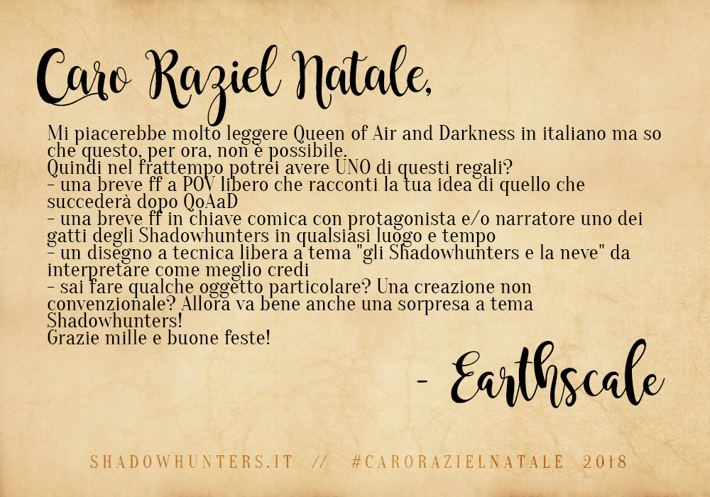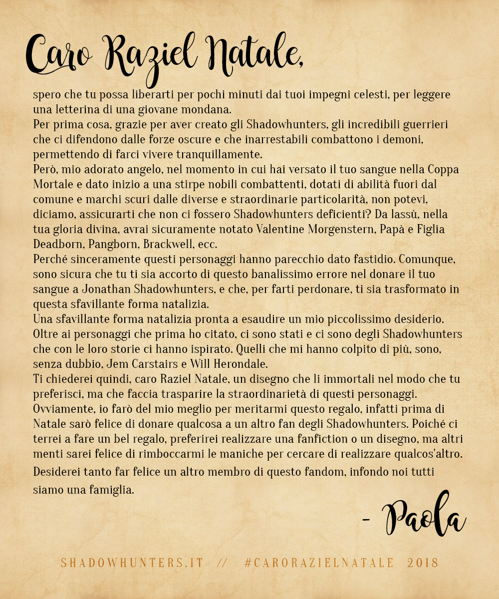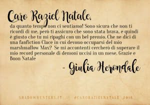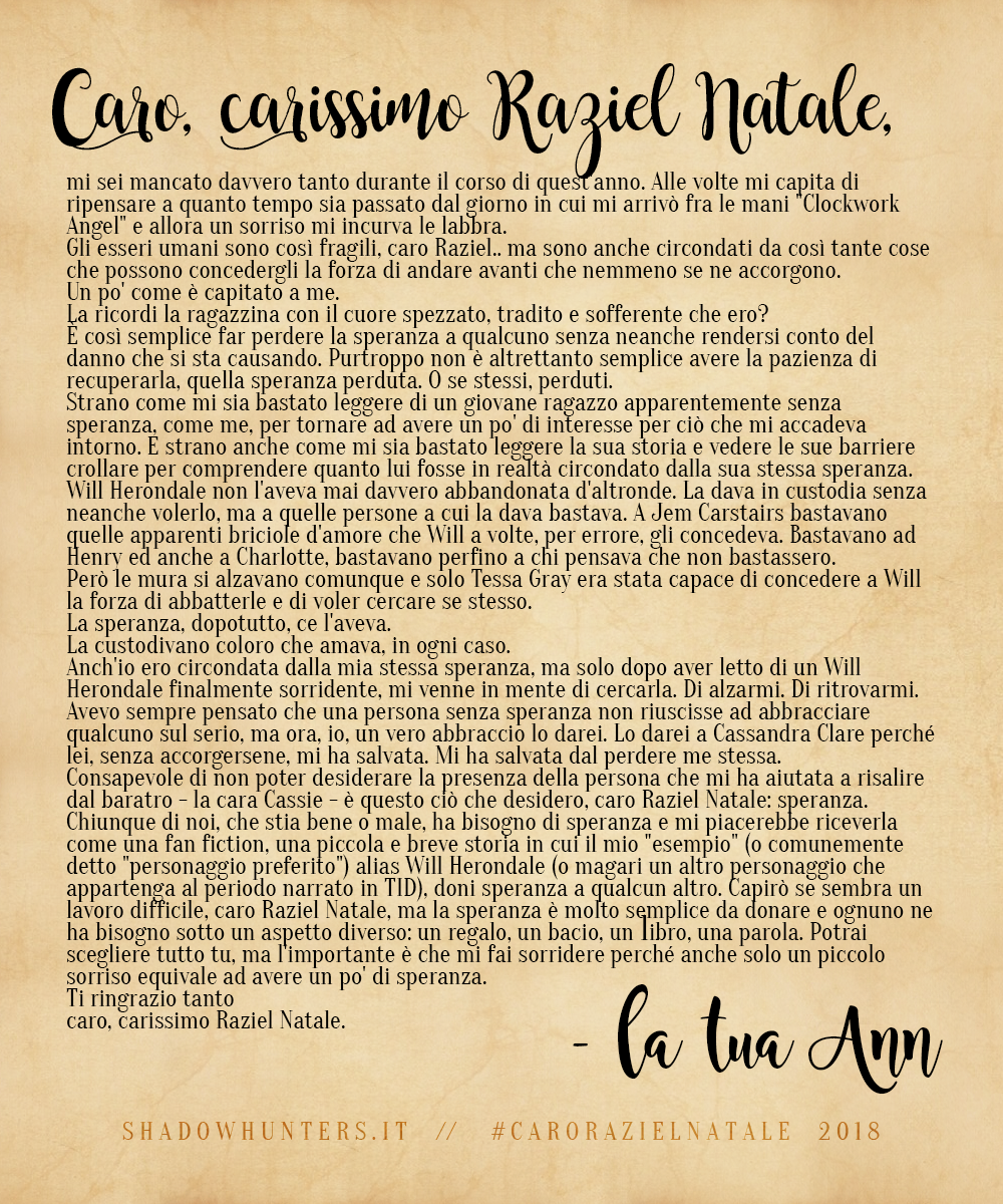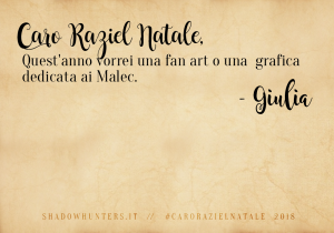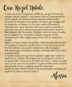 Shadowhunters, riusciamo finalmente a portarvi i risultati della nostra iniziativa di fine anno, “Caro Raziel Natale” (e siamo dispiaciutissime per il ritardo!). ;D