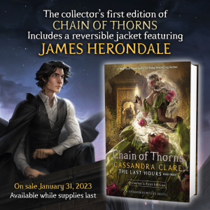 Hello everyone and check out Charlie Bowater’s gorgeous reverse cover art for #Chainofthorns! We worked together to get a spooky, dark London vibe, which will make a ton of sense once you’ve read the book. #jamesherondale #charliebowater #thelasthours #shadowhunters pic.twitter.com/rLkyToSmin